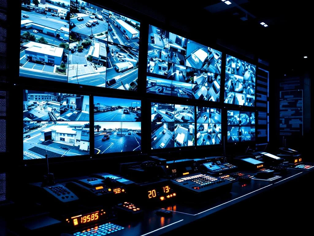 Moderne beveiligingscontrolekamer met meerdere surveillancemonitoren en verlichte bedieningspanelen met blauwe LED-verlichting